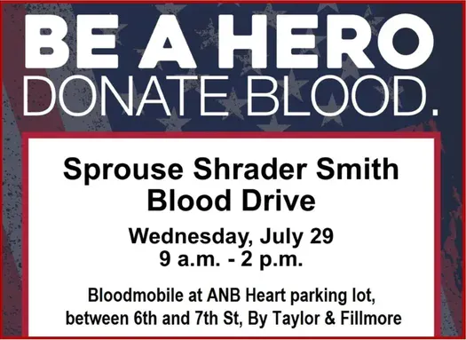 Sprouse Shrader Smith will be hosting a blood drive July 29th from 9:00 a.m. to 2:00 p.m. The Coffee Memorial Bloodmobile will be in the Amarillo National Bank Heart Parking lot located at 601 Taylor St. If you would like to schedule an appointment for that day, call 806.331.8833 or register online at yourbloodinstitute.org.